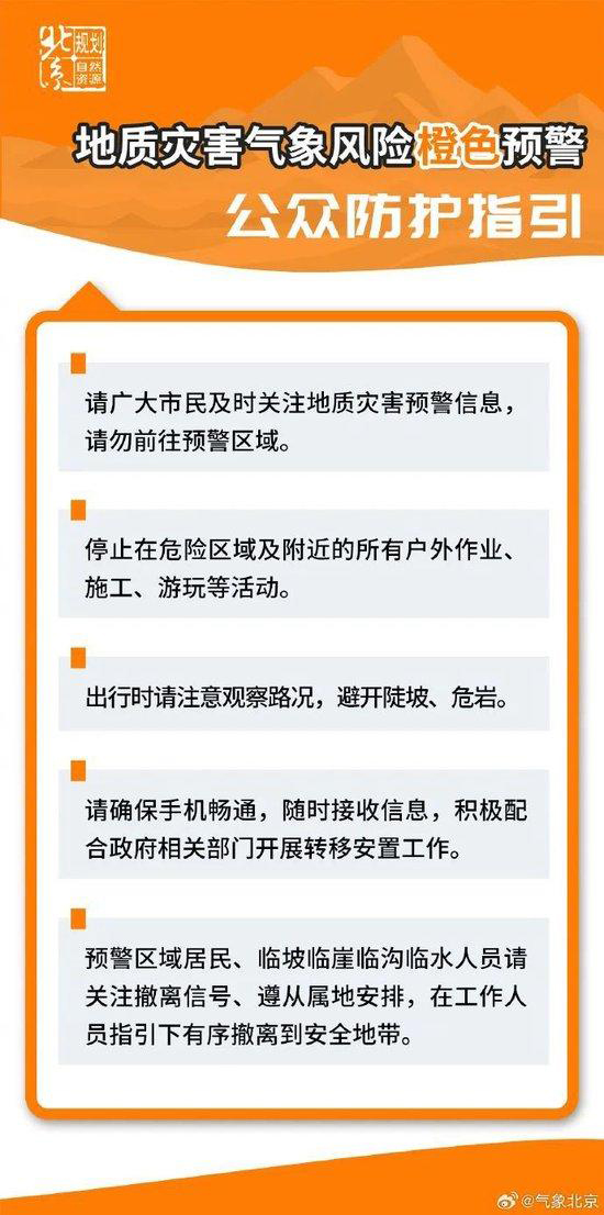 北京市規劃自然資源委聯合市氣象局升級發布地質災害氣象風險橙色預警,8月26日20時至8月27日20時,北京市房山、門頭溝大部發生崩塌、滑坡、泥石流等地質災害的風險高(橙色預警);豐臺西北部,石景山北部,海淀西北部,昌平、延慶大部,懷柔中部,密云西部發生崩塌、滑坡、泥石流等地質災害的風險較高(黃色預警);石景山北部,海淀西部,昌平東北部,懷柔北部、南部,密云、平谷大部有發生崩塌、滑坡、泥石流等地質災害的風險(藍色預警)。