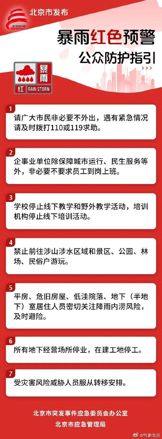 北京市防汛辦提示:防汛一級應急響應區域市民非必要不外出,確需出行人員關注出行提醒,遇有積水路段請勿涉水行車,不要在低洼路段和區域停放車輛。企事業單位除保障城市運行、民生服務等外,非必要不要求員工到崗上班。停止有組織的文旅活動和文化藝術培訓、室內外體育賽事活動及體育運動類培訓活動,并做好人員的安全疏散工作。學校停止全部線下教學活動和野外教學活動,培訓機構停止全部線下培訓活動,妥善安置、安全轉移相應滯留人員。在建工地停工,及時轉移、妥善安置相關工地人員。停止涉山涉水戶外旅游,關閉所有景區、公園、林場,民宿和民俗戶停業,游客疏導勸返,并做好受威脅游客疏散避險。