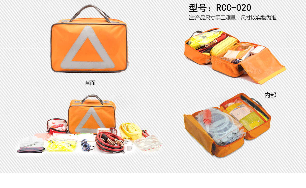 | 型號:RCC-020車載應急包 | 材質:600D滌綸 | 顏色:橘黃 | ||||||