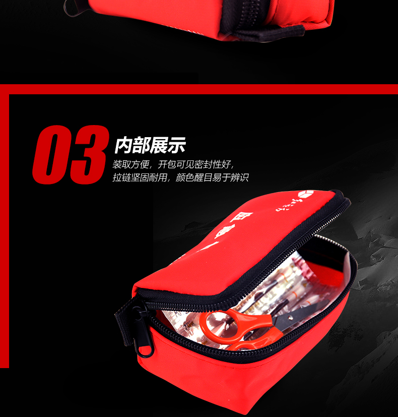 | 外包材質:600D滌綸 | 顏色:紅色 | 型號:RCH-003便攜急救包 | ||||||