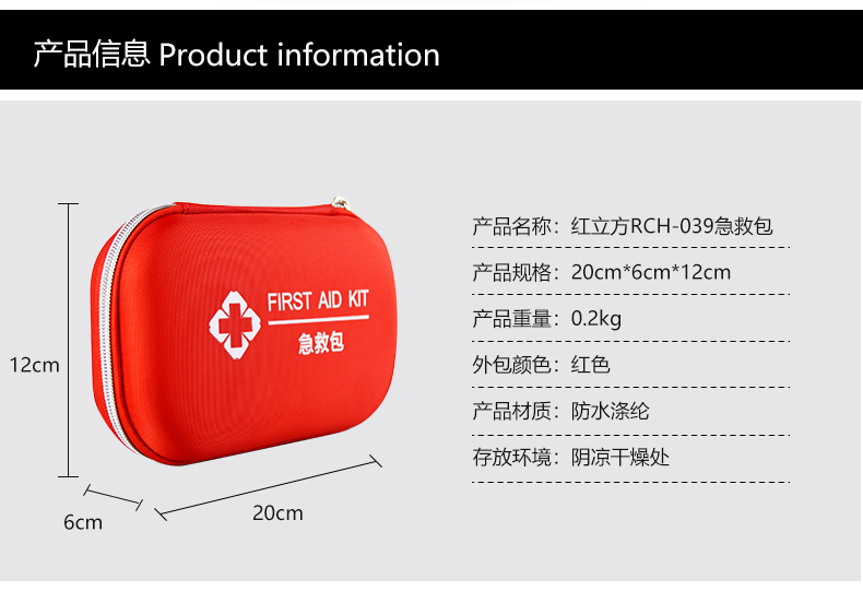 | 型號:RCH-039急救包 | 材質:高強度防水滌綸 | 顏色:紅 | ||||||